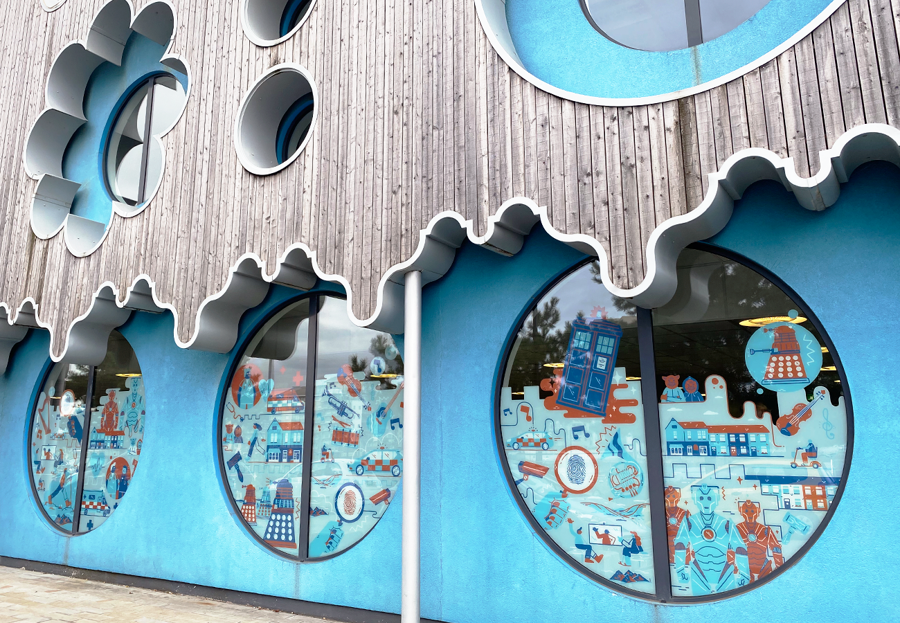 The Roath Loch building in Cardiff is a unique piece of architecture, with a bold facade that is one of a kind. The building is home to BBC Studios Factual Enterainment Productions and long-running drama productions Pobyl Y Com, Casualty and formerly Doctor Who. My brief was to bring some creativity and personality to the cafe area - using their circular windows as the canvas for graphics. Working with local illustrator Matt Joyce, we produced a series of colourful illustrations that showcased the range of programmes produced in the building. Project breakdown Concept & briefing Researching artists Managing timelines & budget
